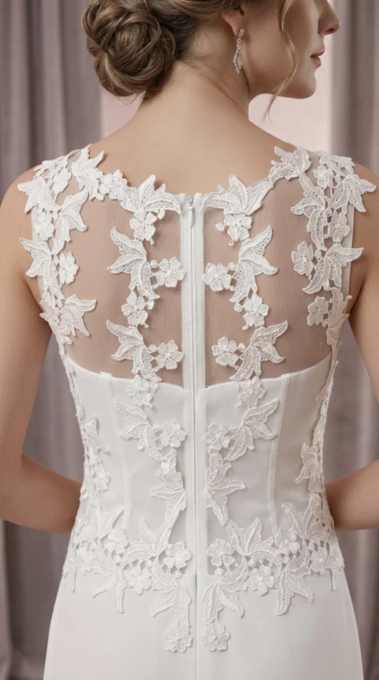Η πλάτη αποτελεί το πιο εντυπωσιακό σημείο του φορέματος, με διακριτική διαφάνεια και περίτεχνη δαντέλα που χαρίζει θηλυκότητα και πολυτέλεια.