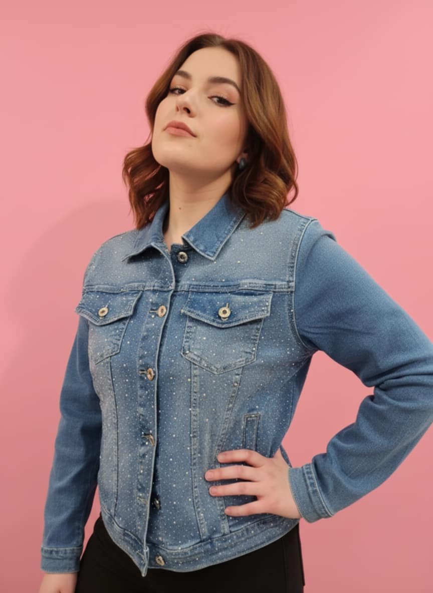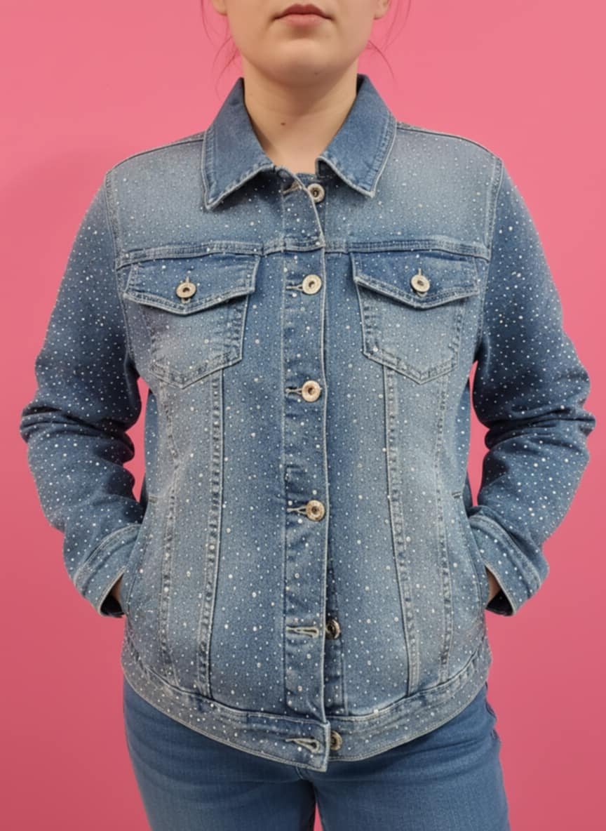 Γυναικείο τζιν τζάκετ σε ελαστική denim ποιότητα που αγκαλιάζει το σώμα και προσφέρει άνεση όλη μέρα. Διακοσμημένο με διακριτικά στρας σε όλη την επιφάνεια, χαρίζει λάμψη χωρίς υπερβολή και αναβαθμίζει ακόμη και το πιο απλό outfit.
