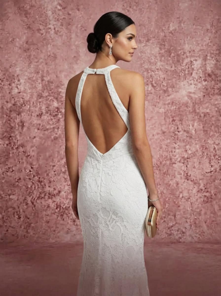 Ρομαντικό λευκό νυφικό φόρεμα από ελαστική δαντέλα με κομψή γραμμή γοργόνα που αγκαλιάζει τη σιλουέτα και αναδεικνύει τη θηλυκότητα. Το halter ντεκολτέ και η ανοιχτή πλάτη δημιουργούν ένα ιδιαίτερα elegant αποτέλεσμα, ενώ η δαντελένια υφή χαρίζει ρομαντική και διαχρονική αισθητική.
