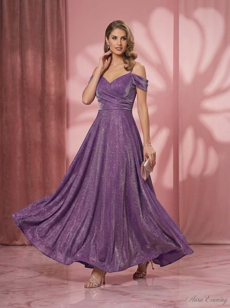 Εντυπωσιακό maxi φόρεμα από λαμπερό λούρεξ ύφασμα με πλούσια φούστα που χαρίζει ρομαντική και αέρινη κίνηση. Το μπούστο αγκαλιάζει το σώμα με κομψό ντεκολτέ και off-shoulder μανίκια που αναδεικνύουν τους ώμους και το ντεκολτέ.