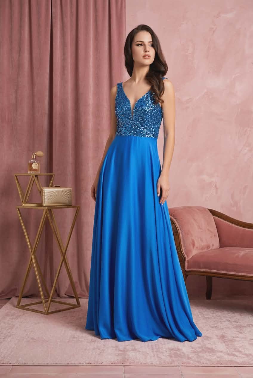 Εντυπωσιακό βραδινό φόρεμα σε βασιλικό μπλε χρώμα με λαμπερό μπούστο διακοσμημένο με παγιέτες. Το βαθύ V ντεκολτέ αναδεικνύει κομψά το μπούστο, ενώ η σατέν φούστα πέφτει απαλά δημιουργώντας μια ρομαντική και αέρινη κίνηση στο περπάτημα.