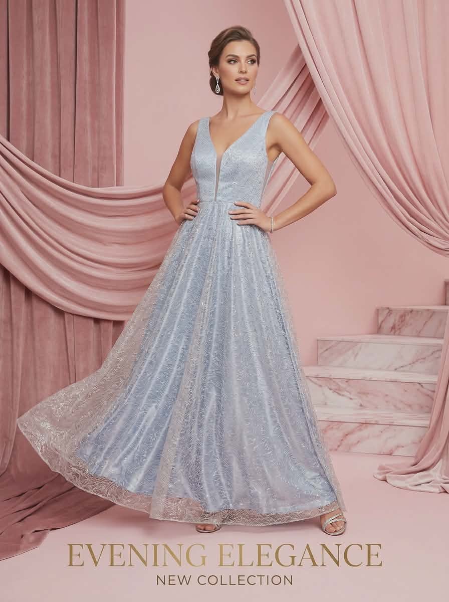 Κομψό βραδινό φόρεμα σε αέρινη γραμμή από φίνο δαντελένιο ύφασμα σε απαλή γαλάζια απόχρωση. Το βαθύ V ντεκολτέ με διακριτική διαφάνεια αναδεικνύει το μπούστο με κομψότητα, ενώ η φούστα ανοίγει απαλά από τη μέση δημιουργώντας μια ρομαντική και ιδιαίτερα θηλυκή σιλουέτα.