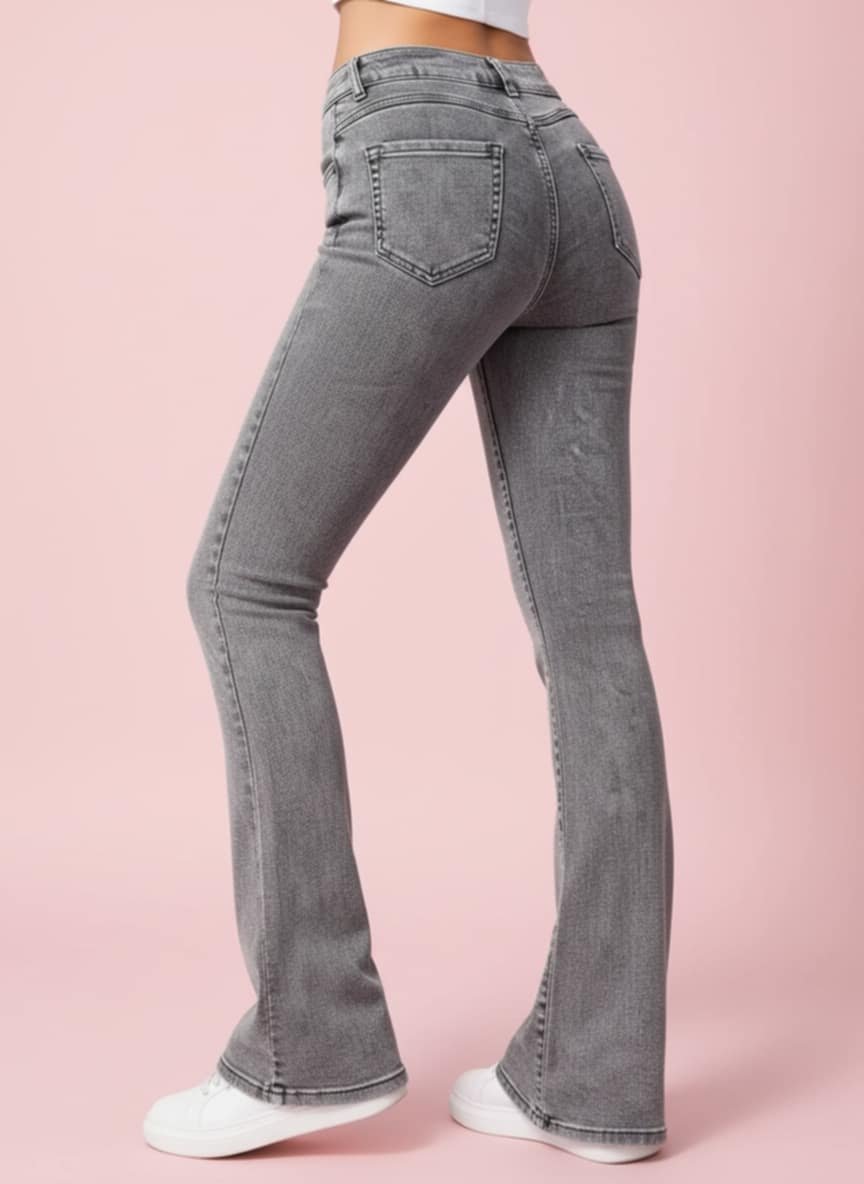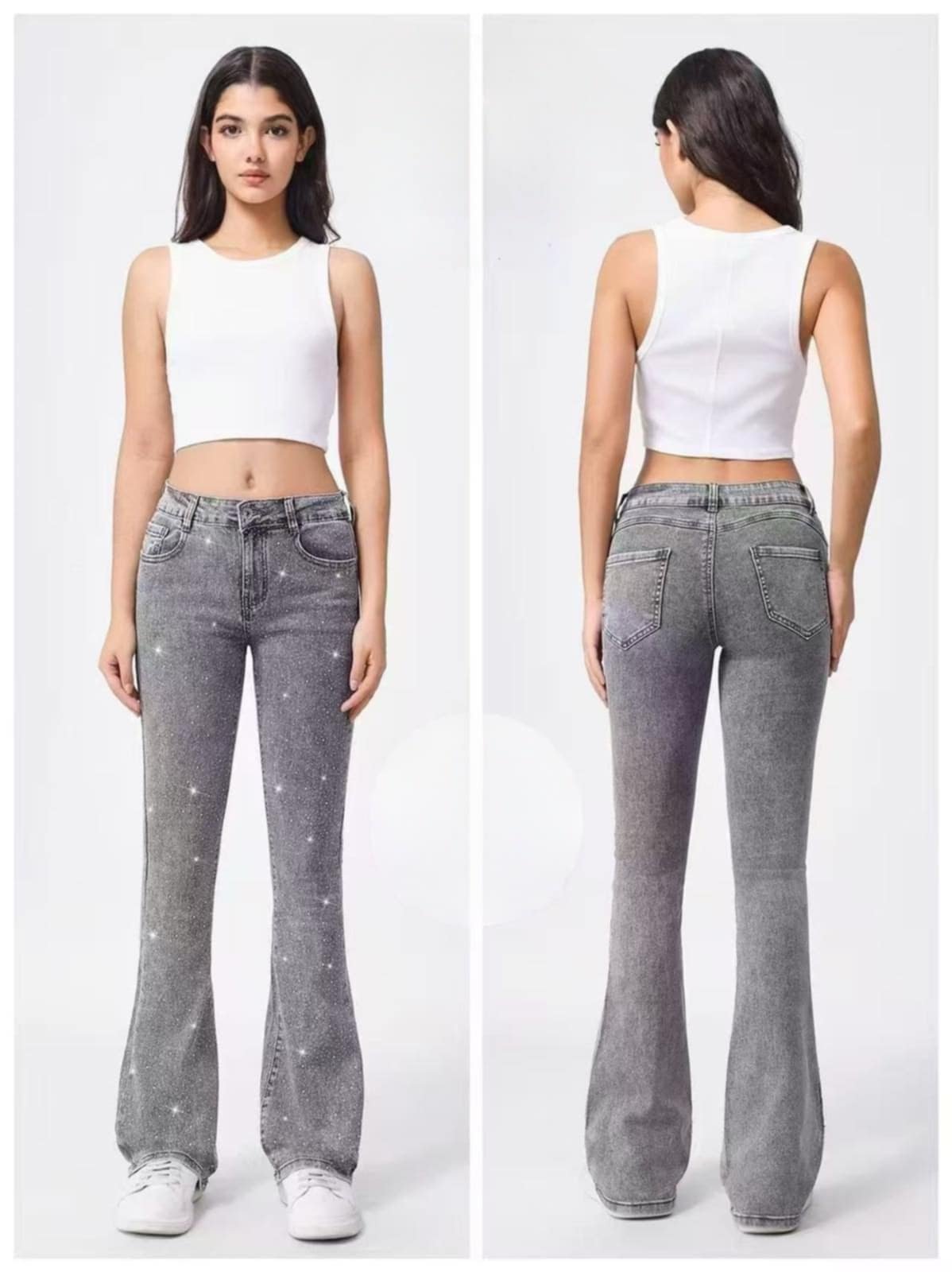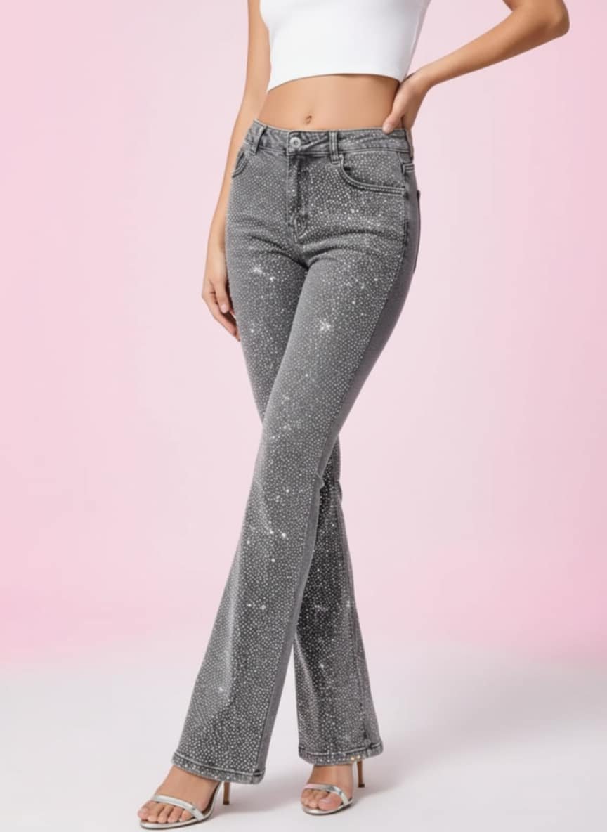 Γκρι flare τζιν με διακριτικά ασημένια στρας και push up εφαρμογή. Θηλυκό, glam και εντυπωσιακό.
