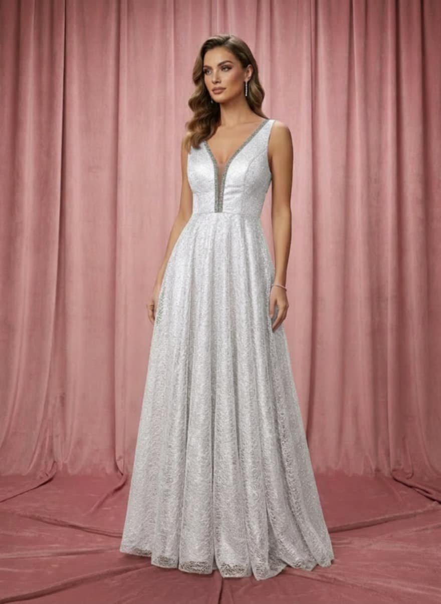 Εντυπωσιακό μακρύ λευκο φόρεμα από φίνα δαντέλα και δίχτυ με πολυτελείς λεπτομέρειες από στρας που διακοσμούν το ντεκολτέ και την ανοιχτή πλάτη. Το βαθύ V μπροστά επιμηκύνει τη σιλουέτα, ενώ η πλάτη με το ιδιαίτερο άνοιγμα δημιουργεί ένα άκρως θηλυκό και elegant αποτέλεσμα.
