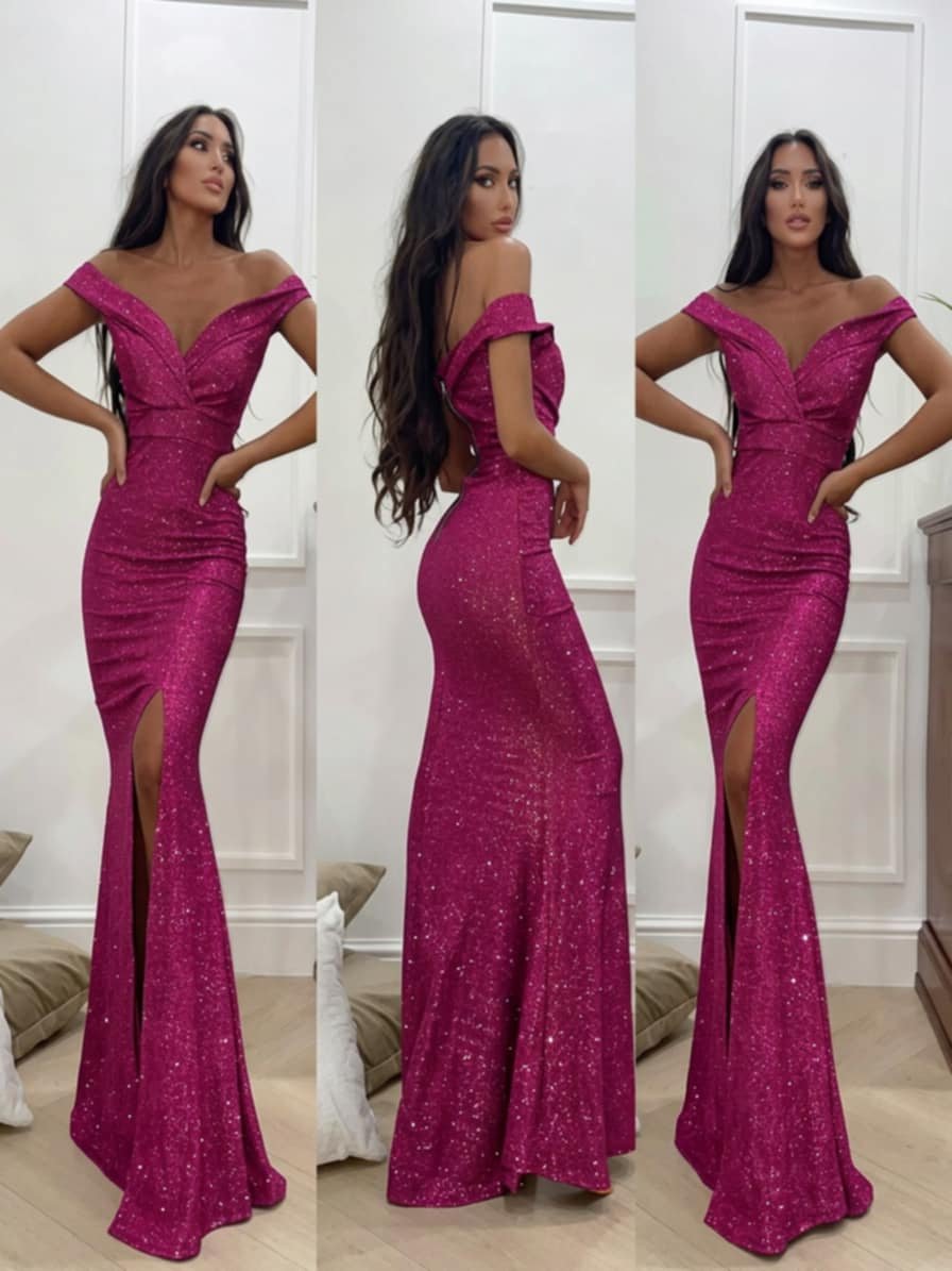 Εντυπωσιακό maxi φόρεμα σε έντονη φούξια glitter απόχρωση, ιδανικό για glamorous εμφανίσεις. Το βαθύ V ντεκολτέ και το off-shoulder σχέδιο αναδεικνύουν τους ώμους και το μπούστο, ενώ η εφαρμοστή γραμμή αγκαλιάζει το σώμα δημιουργώντας μια θηλυκή και κομψή σιλουέτα.