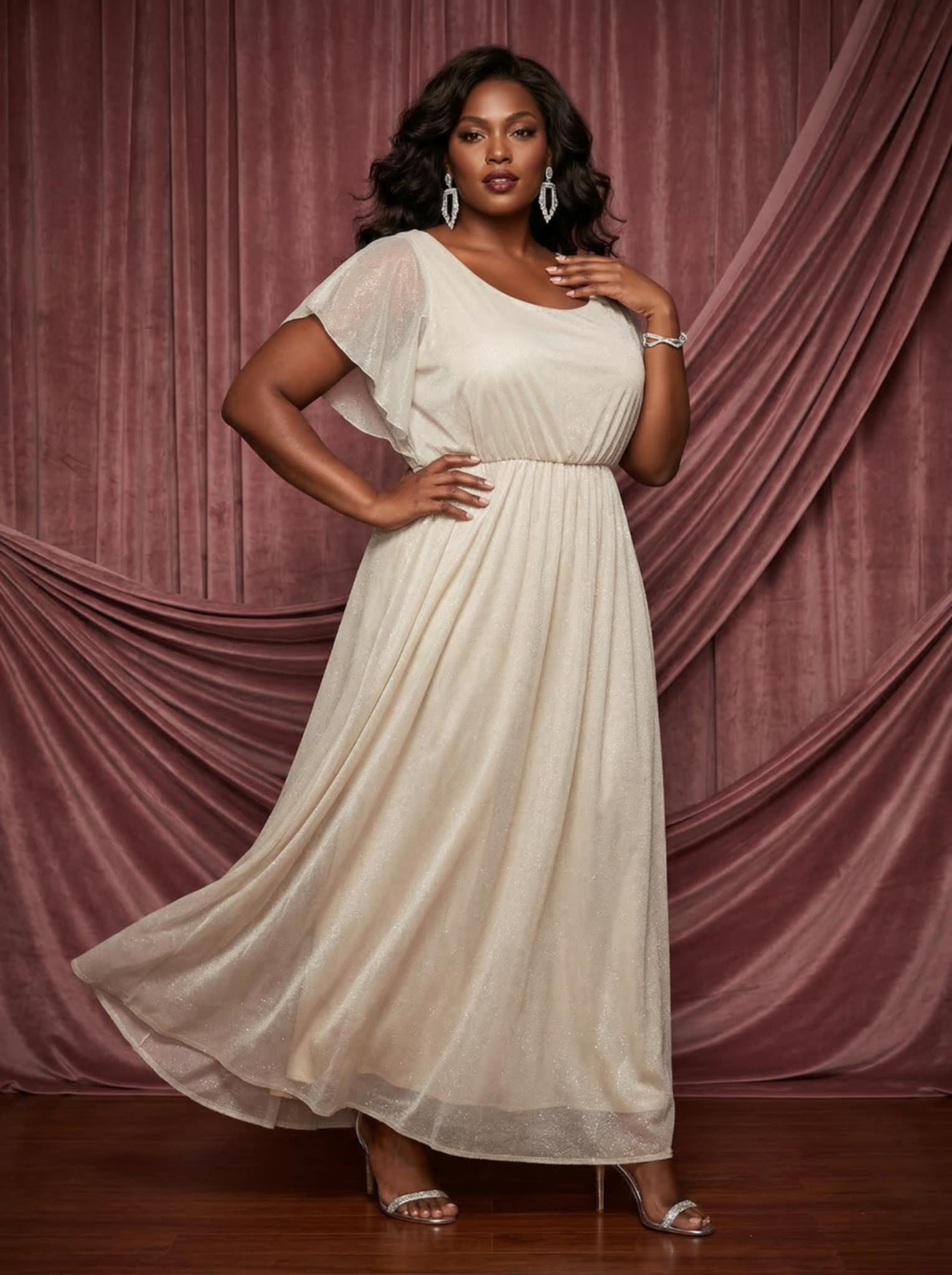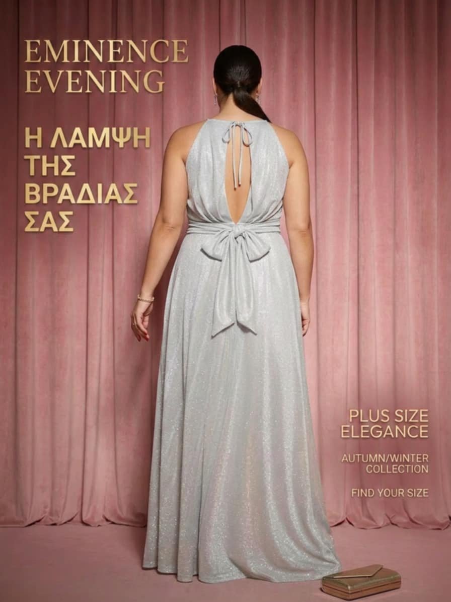 Ρομαντικό λευκό maxi φόρεμα με διακριτικό glitter, ιδανικό για νύφες που αναζητούν μια κομψή και minimal bridal επιλογή. Η halter γραμμή αναδεικνύει τους ώμους και το ντεκολτέ, ενώ η ζώνη στη μέση δημιουργεί μια θηλυκή και ισορροπημένη σιλουέτα.