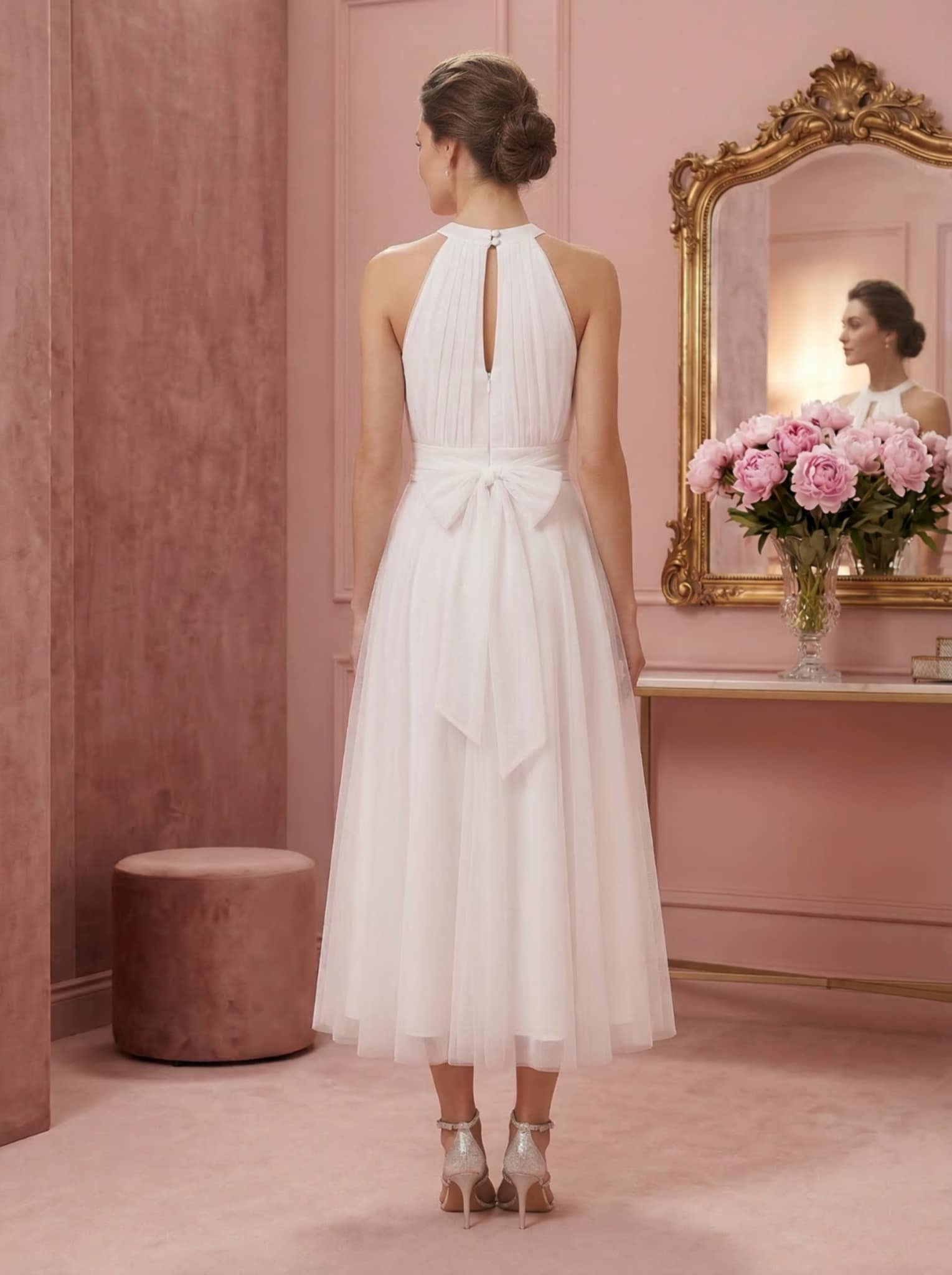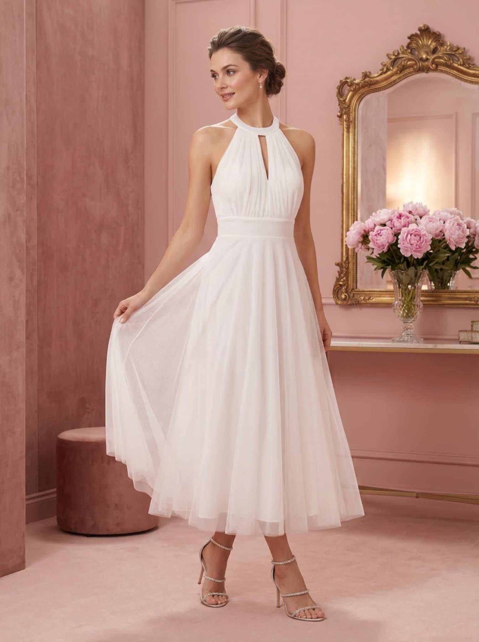 Ρομαντικό λευκό τούλινο φόρεμα με halter λαιμό, που δένει κομψά στο πίσω μέρος και αναδεικνύει τους ώμους και την πλάτη. Η ελαφριά τούλινη φούστα δημιουργεί μια αέρινη και θηλυκή κίνηση, ενώ η εφαρμοστή μέση τονίζει τη σιλουέτα.