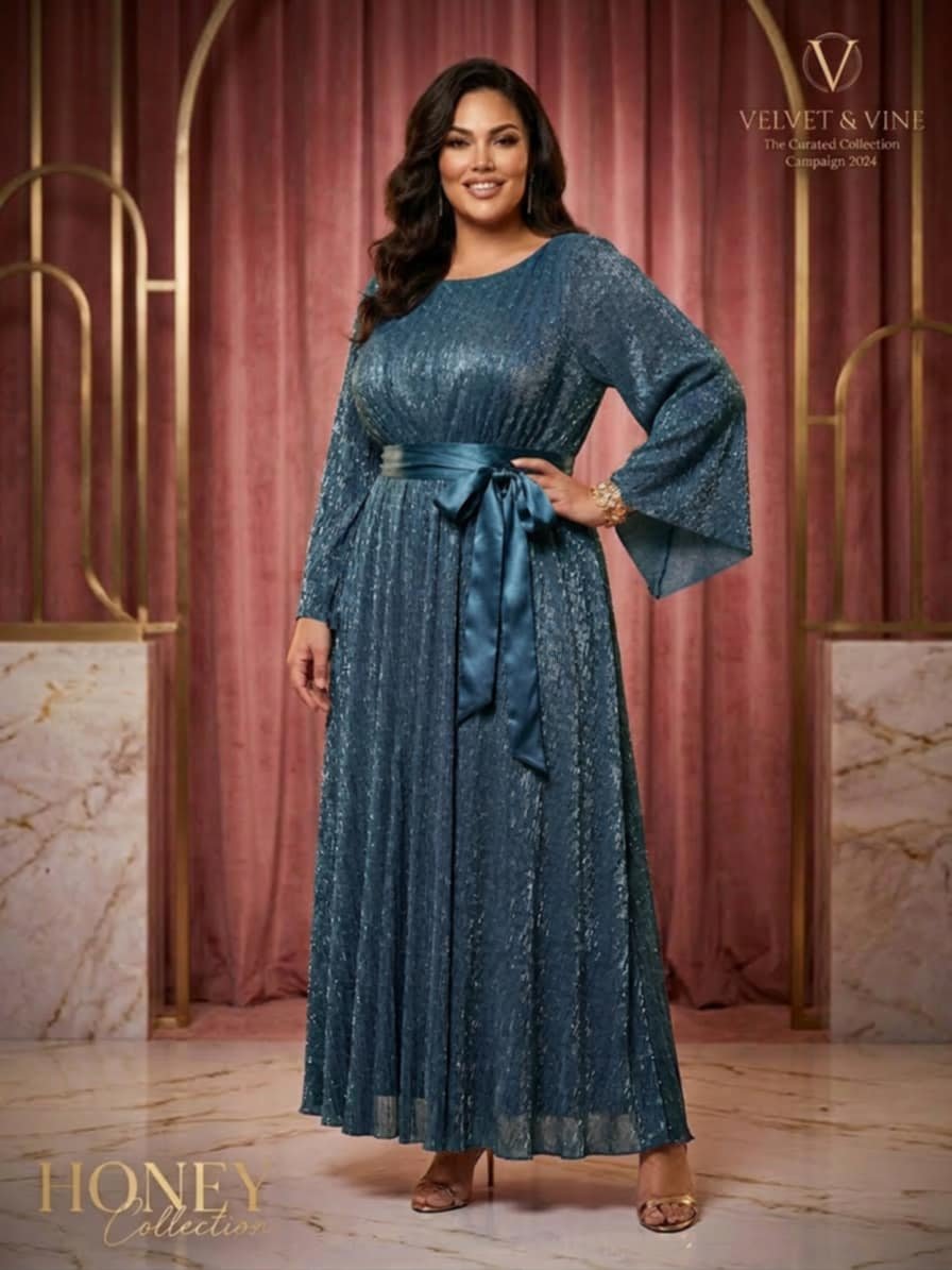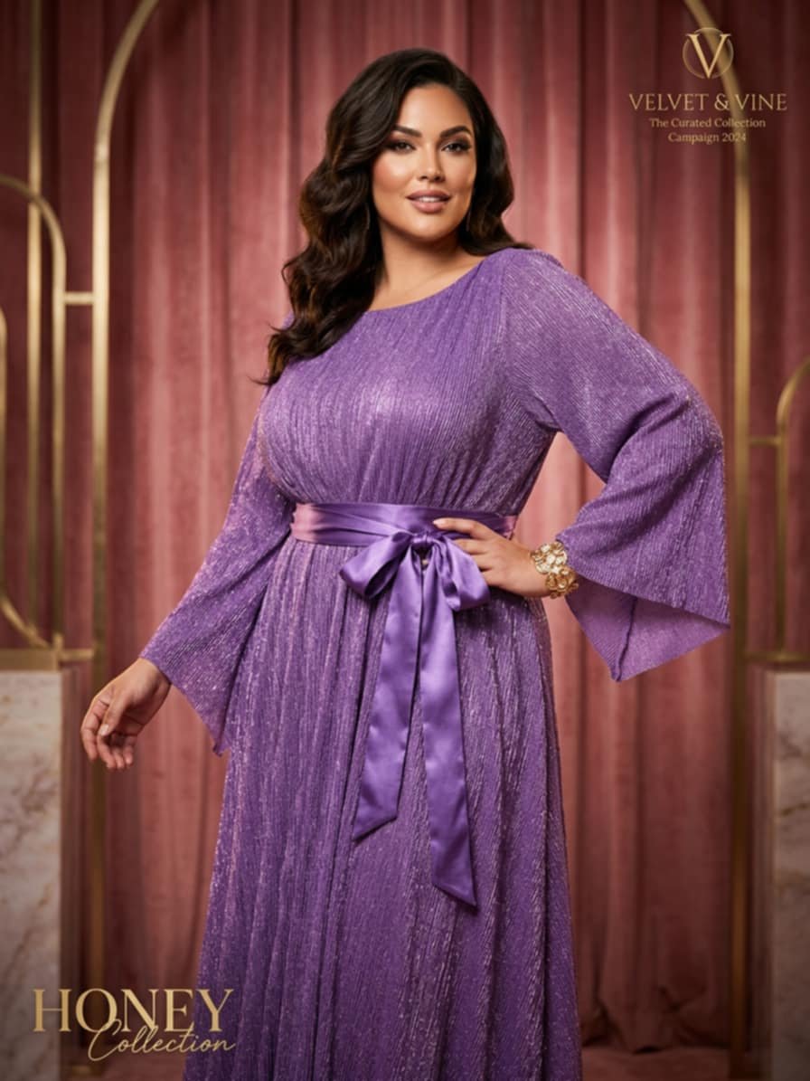 Εντυπωσιακό plus size βραδινό φόρεμα από lurex ύφασμα με διακριτική μεταλλική λάμψη, σχεδιασμένο για να χαρίζει κομψότητα και άνεση σε κάθε περίσταση. Η ελαστική του υφή αγκαλιάζει απαλά το σώμα, ενώ τα αέρινα μανίκια και η σατέν ζώνη στη μέση δημιουργούν μια θηλυκή και ισορροπημένη σιλουέτα.