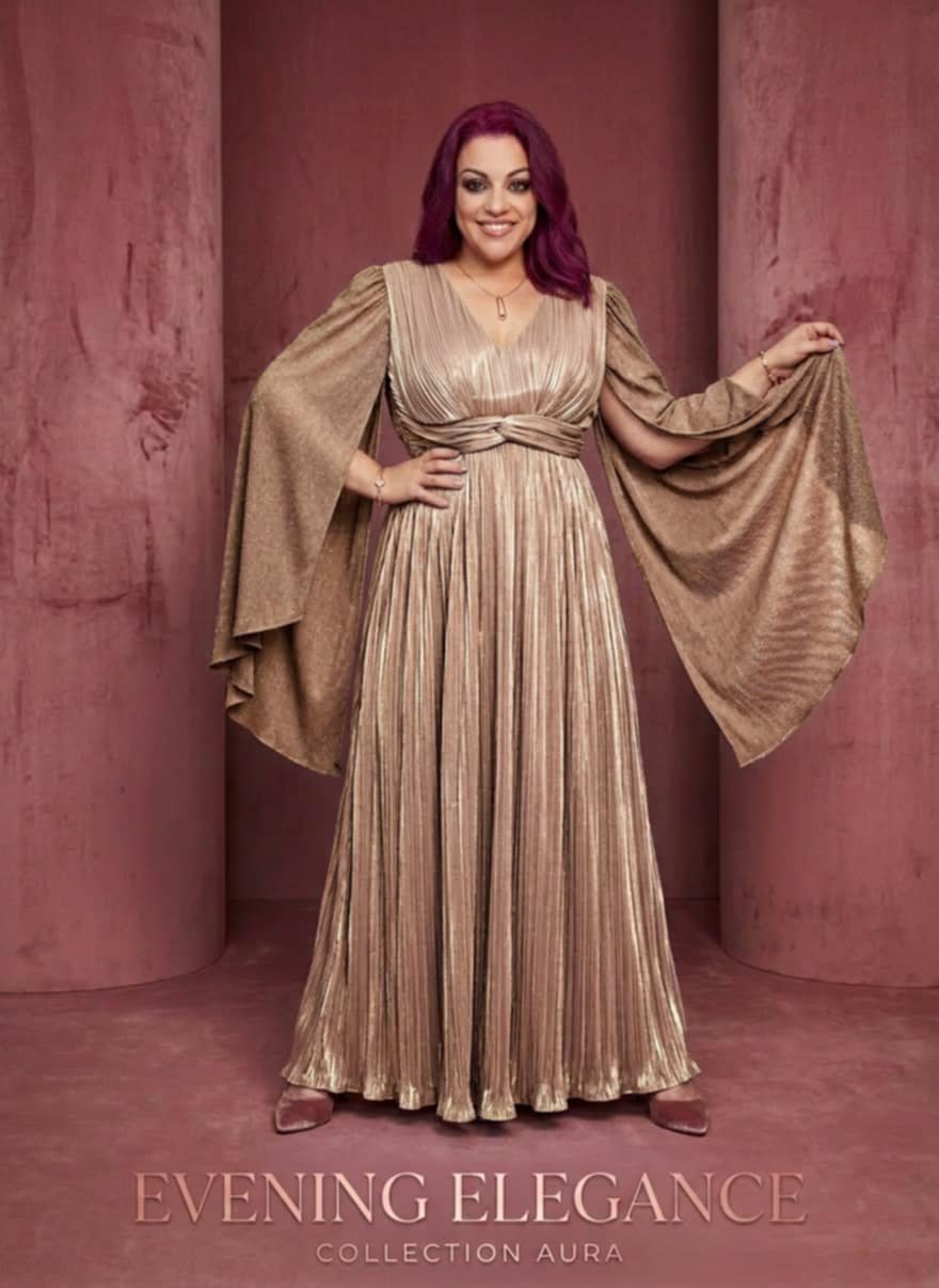 Εντυπωσιακό plus size βραδινό φόρεμα από lurex ύφασμα με διακριτική μεταλλική λάμψη, σχεδιασμένο για να χαρίζει κομψότητα και άνεση σε κάθε περίσταση