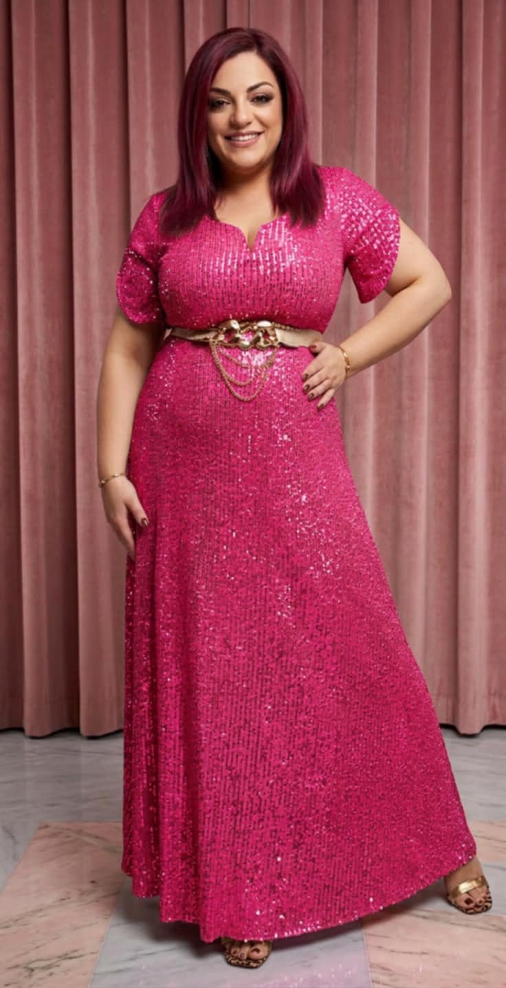 Εντυπωσιακό plus size βραδινό φόρεμα με παγιέτες σε όλο το ύφασμα, σχεδιασμένο για γυναίκες που θέλουν λάμψη, κομψότητα και άνεση σε κάθε επίσημη εμφάνιση. Η απαλή ελαστική του εφαρμογή αγκαλιάζει το σώμα χωρίς να πιέζει, ενώ η μακριά γραμμή χαρίζει κομψή κίνηση και θηλυκή σιλουέτα.