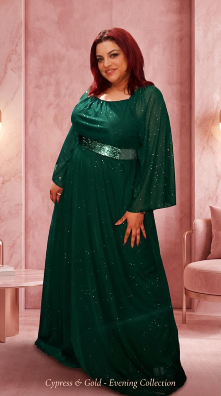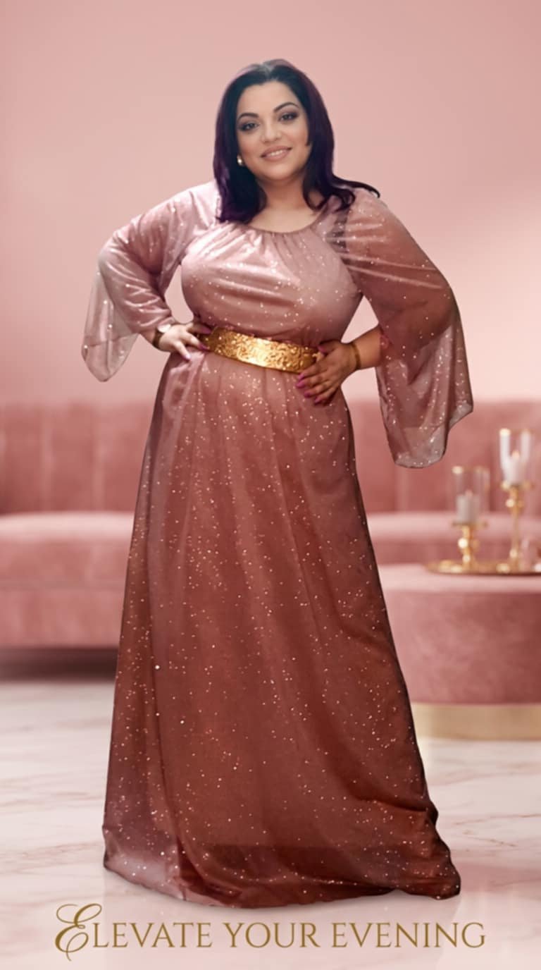 Κομψό και λαμπερό maxi βραδινό φόρεμα με διακριτικό glitter σε όλο το ύφασμα, που χαρίζει φωτεινή και elegant εμφάνιση. Η γραμμή του φορέματος προσφέρει άνεση και κίνηση, ενώ η ψηλή μέση τονίζεται με ζώνη που αναδεικνύει τη σιλουέτα.