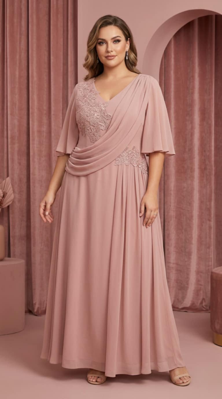 Ρομαντικό και κομψό plus size φόρεμα σε απόχρωση dusty rose, ιδανικό για ιδιαίτερες περιστάσεις που απαιτούν θηλυκότητα και διακριτική κομψότητα.