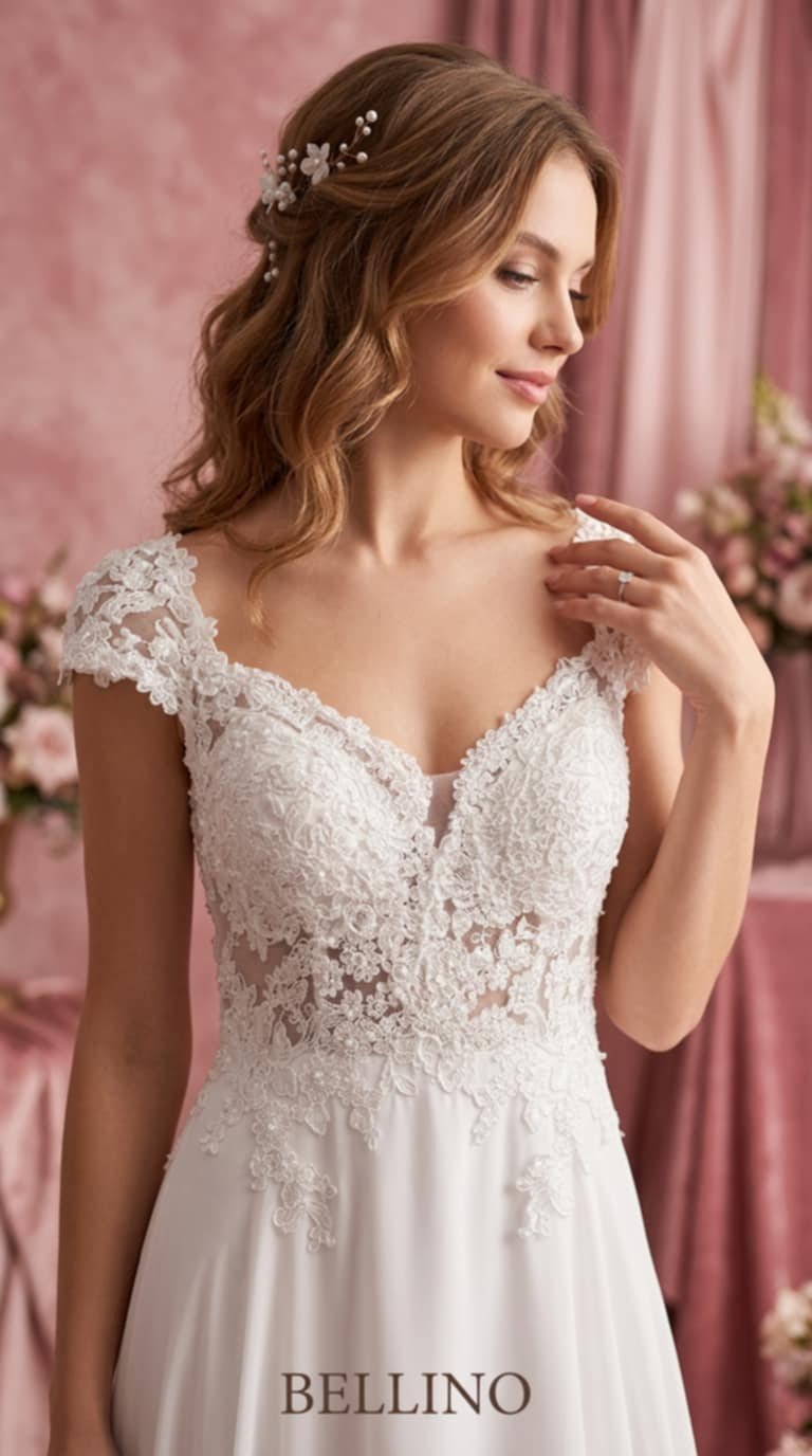 Ρομαντικό και αέρινο νυφικό φόρεμα με δαντέλα και off-shoulder μανίκια, ιδανικό για brides που θέλουν μία ονειρική αλλά ταυτόχρονα κομψή εμφάνιση.