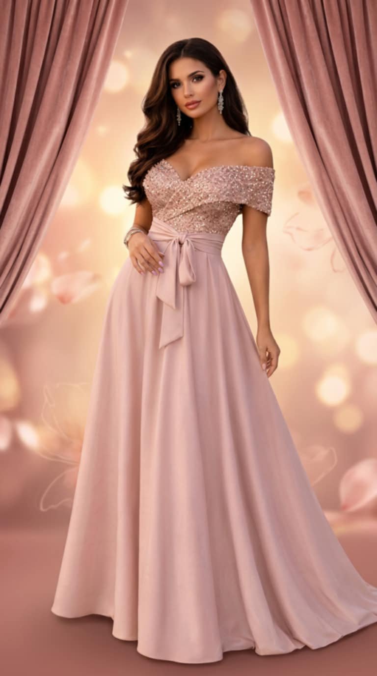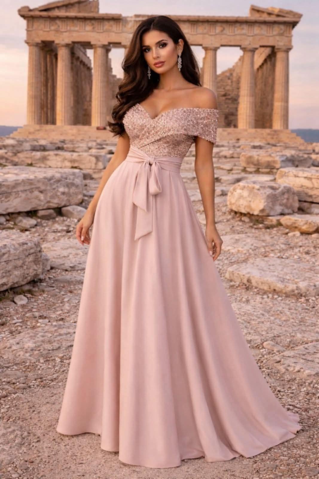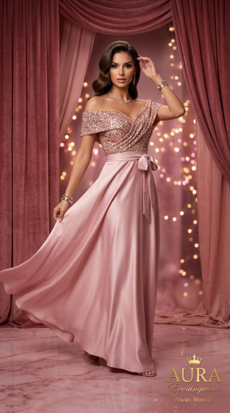86. Dusty Pink Maxi Φόρεμα με Rose Gold Παγιέτα & Satin Φούστα