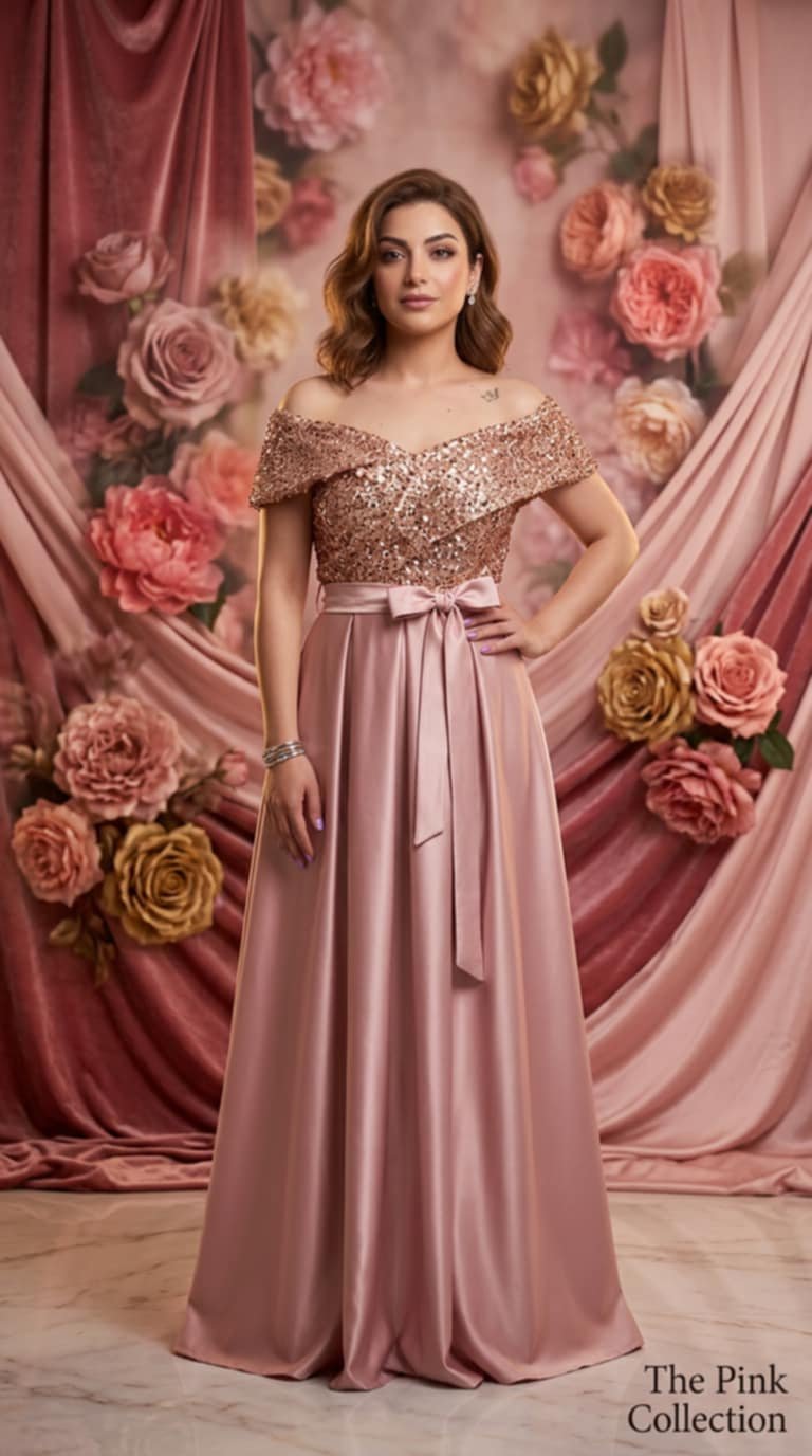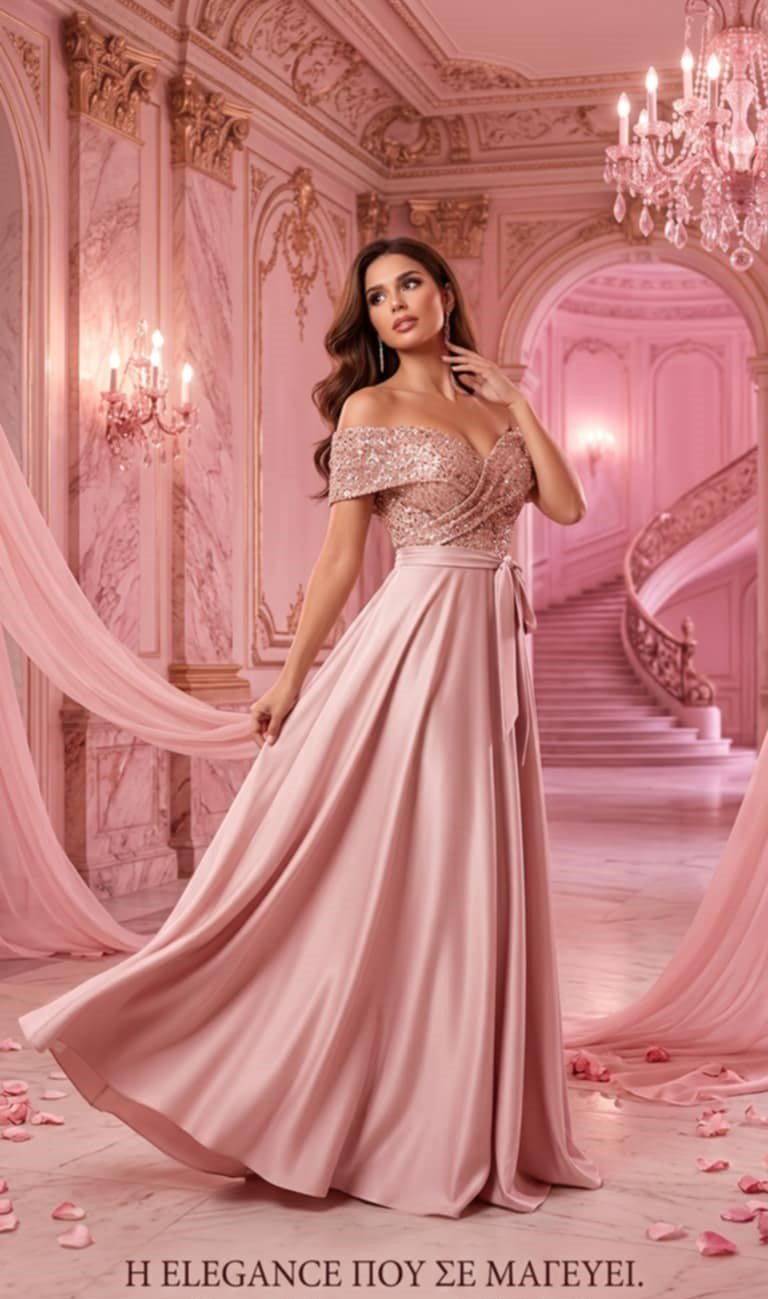 Ο εντυπωσιακός μπούστος με ροζ-χρυσή παγιέτα χαρίζει λάμψη χωρίς υπερβολή, ενώ η μάτ σατέν φούστα πέφτει αέρινα, δημιουργώντας μία elegant και ισορροπημένη σιλουέτα.