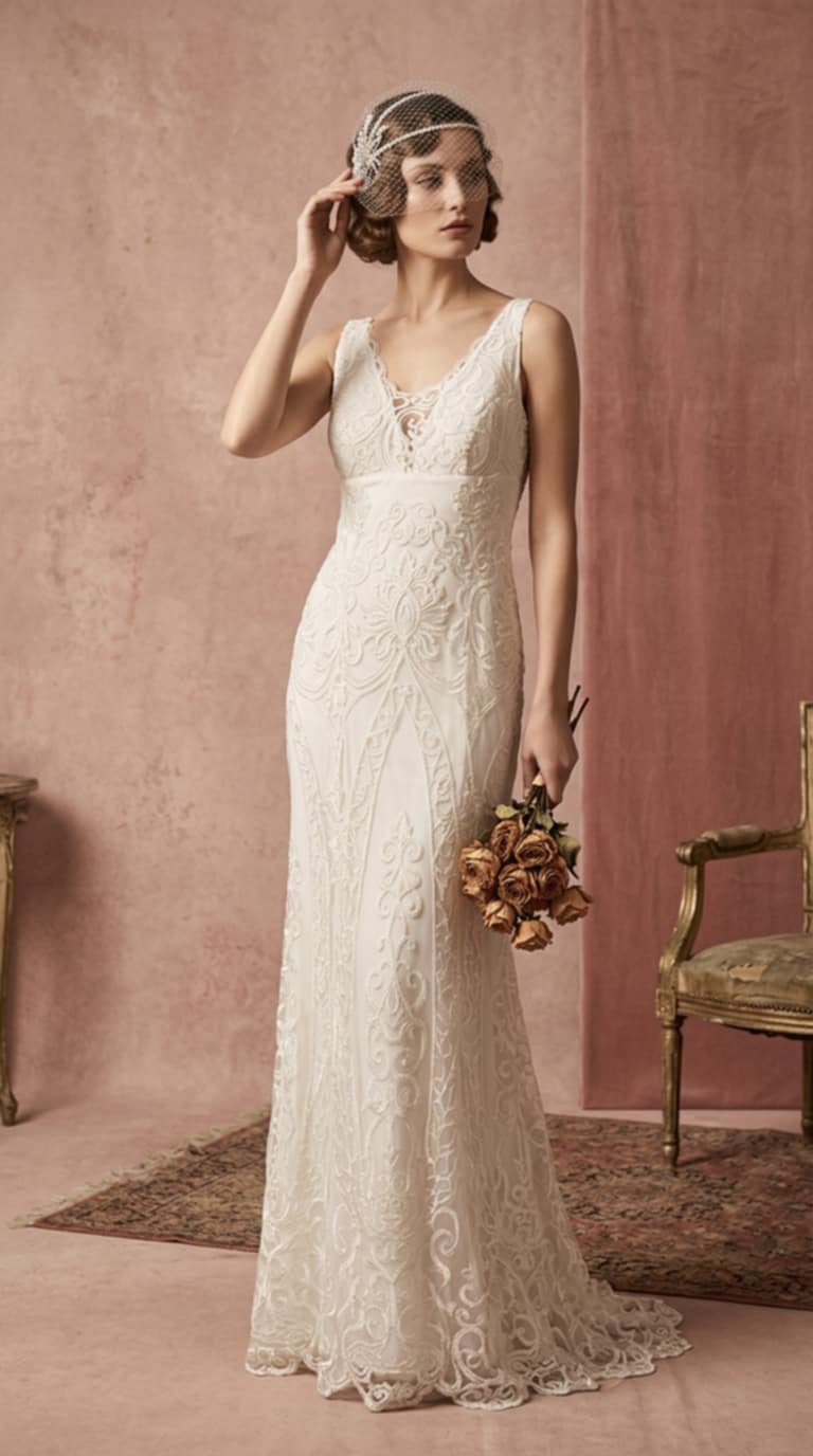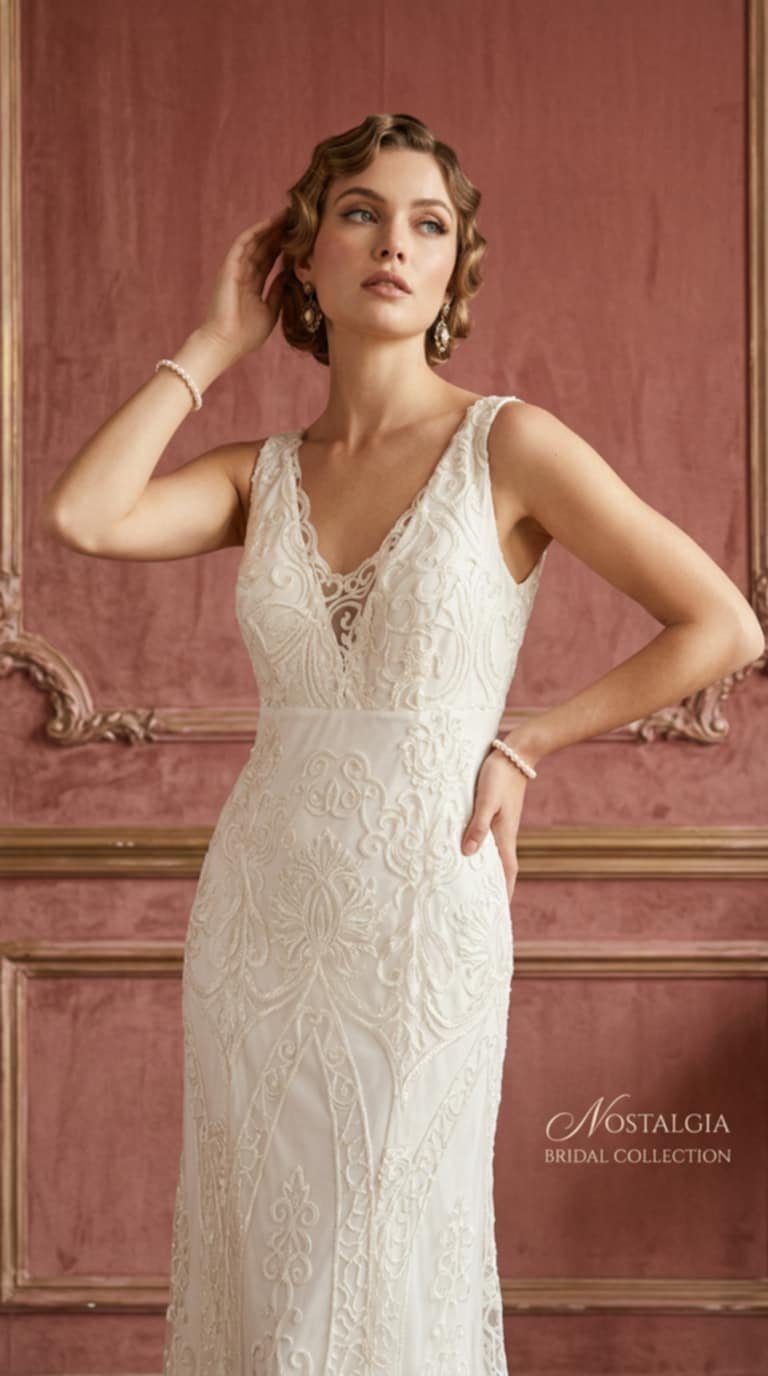 93. Δαντελένιο Νυφικό σε Στενή Γραμμή με Διακριτική Παγέτα – Vintage Nostalgia Bridal