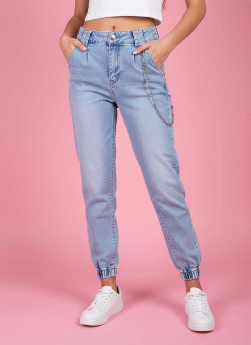 .7 . Γυναικείο Τζιν Cargo με Αλυσίδα & Ρεβέρ – Ελαστικό Denim