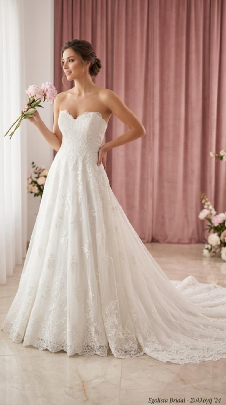 Strapless Δαντελένιο Νυφικό με Ουρά – Princess A-Line